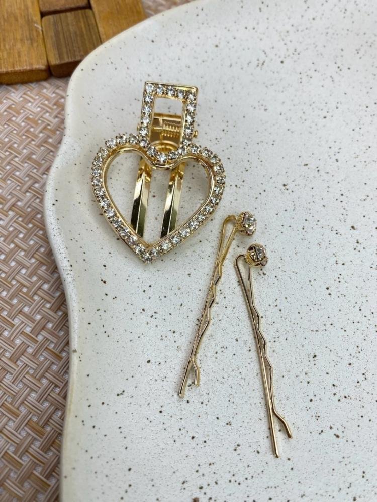 Kit 3 peças coração cravejado e dupla de grampos com ponto de luz.