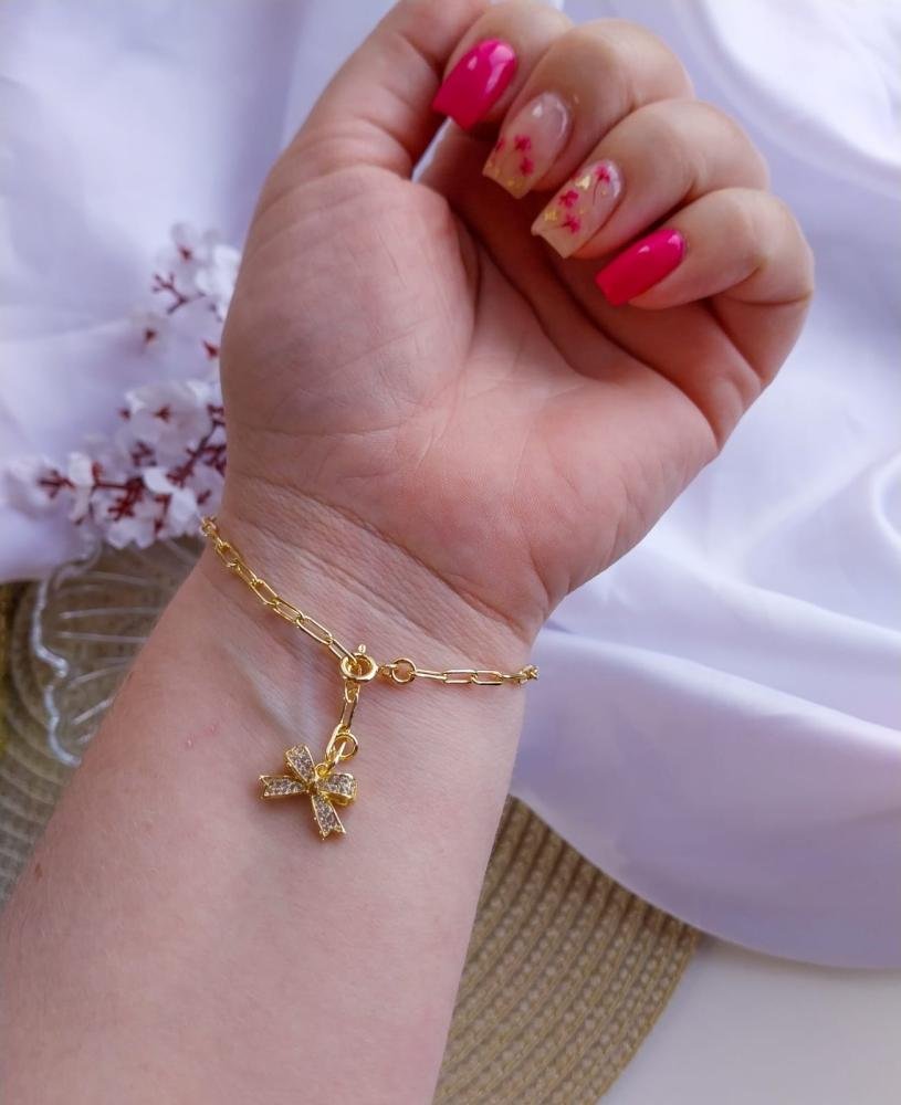 Pulseira corrente pingente de laço cravejado.